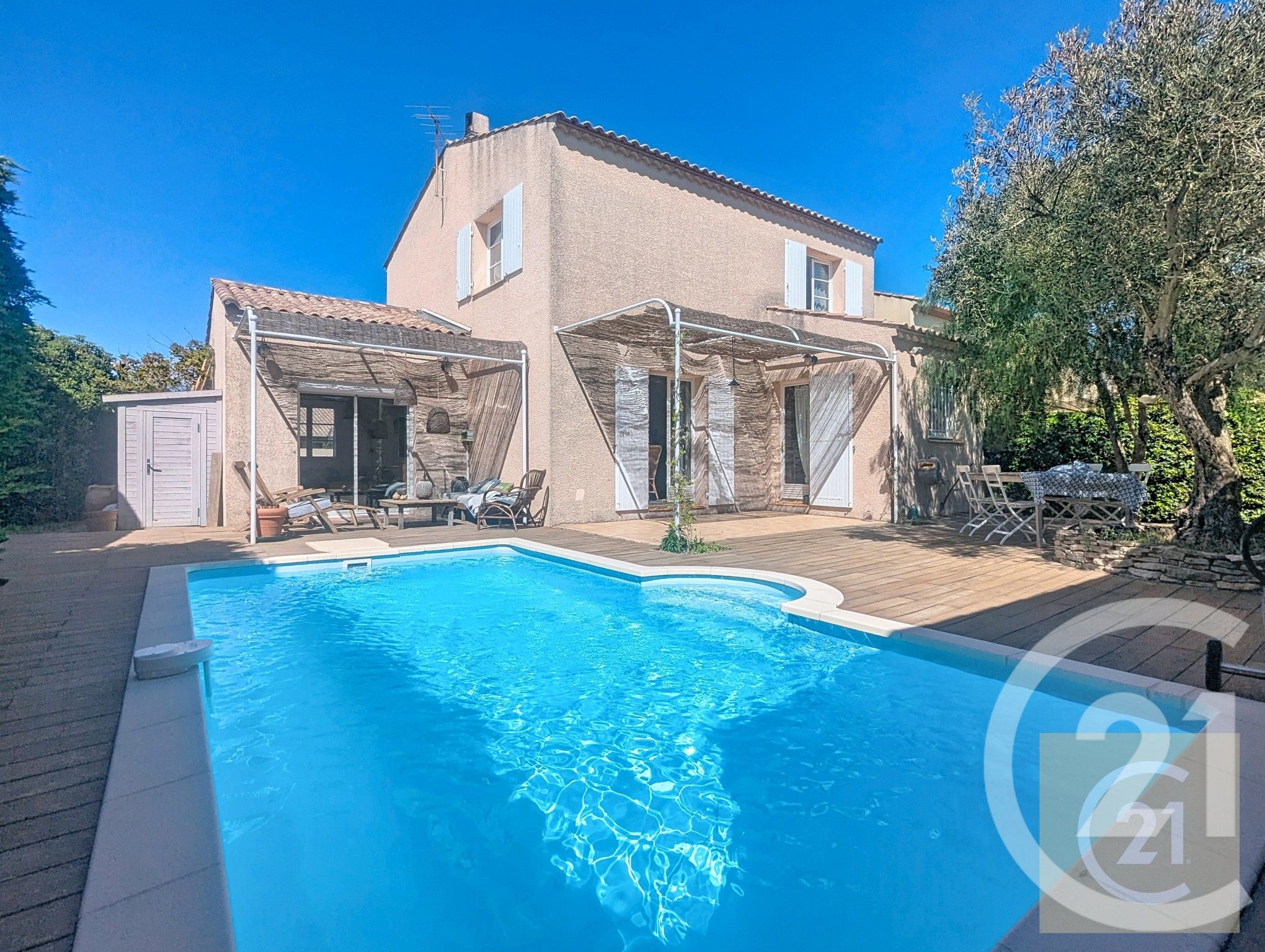 A l'extérieur, le jardin est entièrement aménagé avec l'espace piscine convivial offrant une terrasse en bois exotique avec pergolas et son bel olivier accueillant un salon de jardin, un coin détente et un espace repas pour de belles soirées d'été.